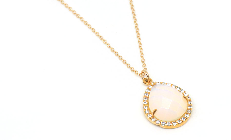 Gold filled necklace length is 18"; comes with 1" extenderSparkled with white opal gemstone pendant framed in 18KT gold-platedShips with eco-friendly tissue paper and gold-plated logo charm
